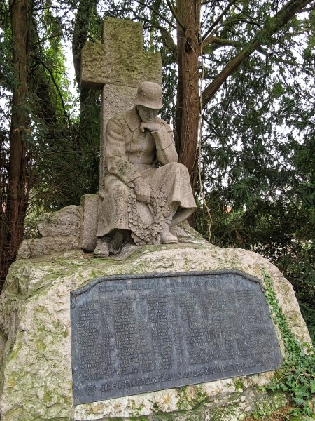 Auf dem Stein ist ein kirchliches Kreuz vorhanden, vor dem eine sitzende Soldatenskulptur mit Lorbeerkranz überlebensgroß dargestellt ist.