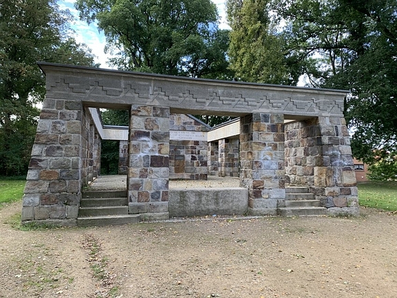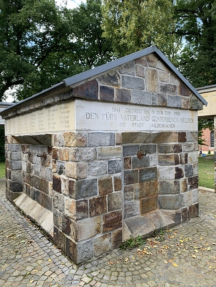 Im Inneren der Anlage aus gemauerten Natursteinen das bedachte „Haus“ für die Kriegstoten des Ersten Weltkrieges mit 120 Namen auf einem umlaufenden Sandsteinband und Inschrift.