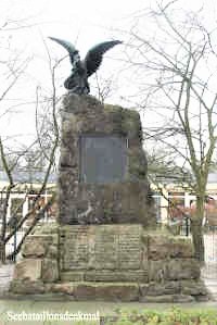 Bronzetafel mit Namen der Vermissten, Verstorbenen und Gefallenen, 1878, 1885, 1900 am Denkmal, Granitplatte mit Widmung für die im Ersten Weltkrieg Gefallenen am Sockel.