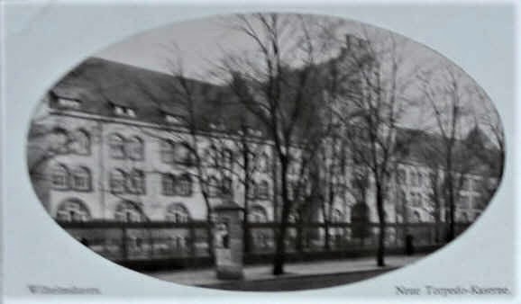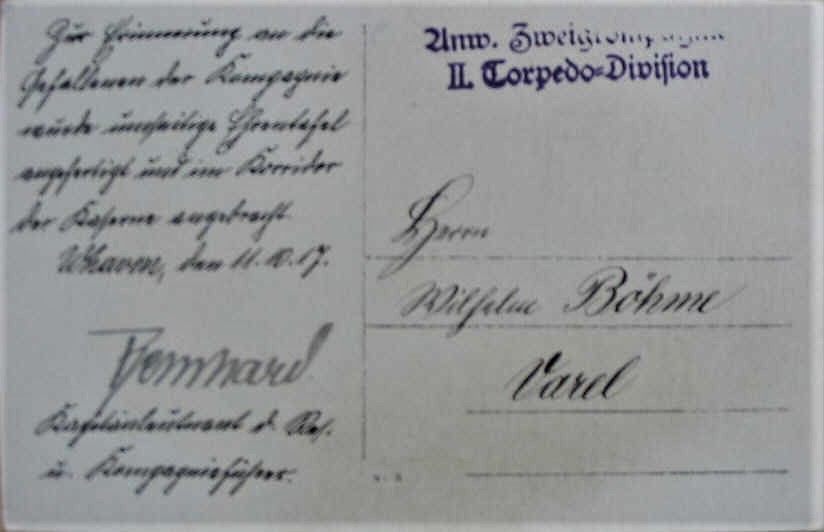 Anschriftenfeld ein Stempelabdruck: Anw. Zweigkompagnie 2. Torpedodivision (teilweise verblasst). Die Torpedokaserne existiert noch heute. Bis vor einigen Wochen befand