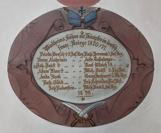 Ovale Gedenktafel mit den in Gold gefassten Namen und Einheiten der Teilnehmer des Feldzuges 1870/71 in einem reich verzierten Sandsteinrahmen (u.a. Tatzenkreuz, gekreuzte Fahnen und Säbel) an der rechten Längswand in der Ägidius-Kirche.