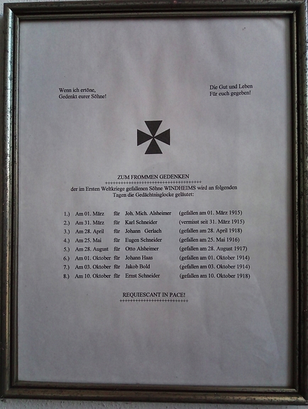 der im Ersten Weltkrieg gefallenen Söhne WINDHEIMS