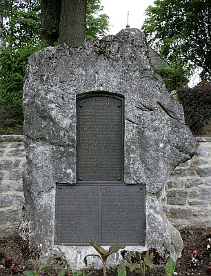 Steinfindling in einer Mauer. Im Findling sind zwei Gedenktafeln aus Metall eingearbeitet.