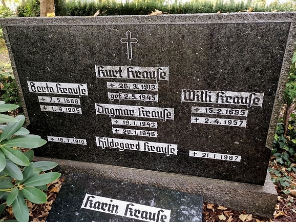 Technischer Angestellter; gefallen bei den Kämpfen am Flakturm Humbolthain; Kriegsgräberstätte Berlin-Reinickendorf, Friedhof Wittenau, Block II Reihe 1a Grab 14a; Ehemann von Hildegard Krause, geb. Teßmann (1910-1987) |