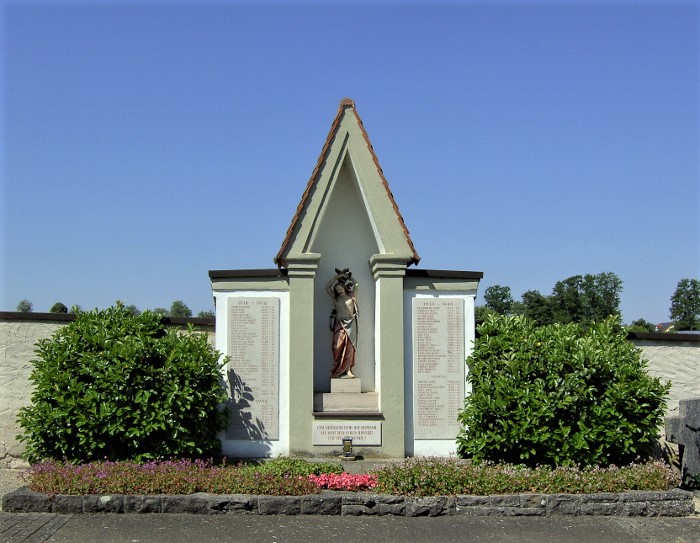 Denkmal auf dem Friedhof: Linke Seite Steinplatte mit den Namen beider Weltkriege, auf der rechten Seite Steinplatte mit den Namen des Zweiten Weltkriegs.