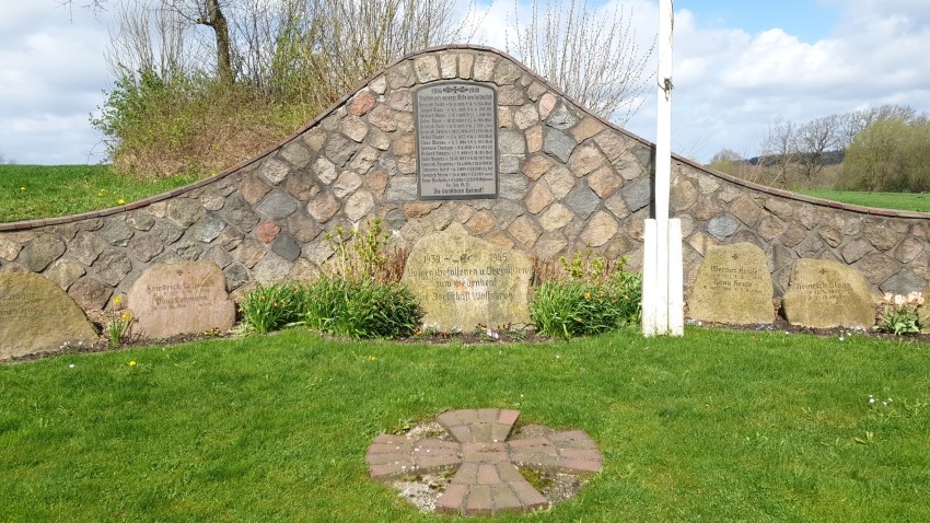 An einer geschwungenen Natursteinmauer die Gedenktafel für die 15 Kriegstoten des Ersten Weltkrieges.