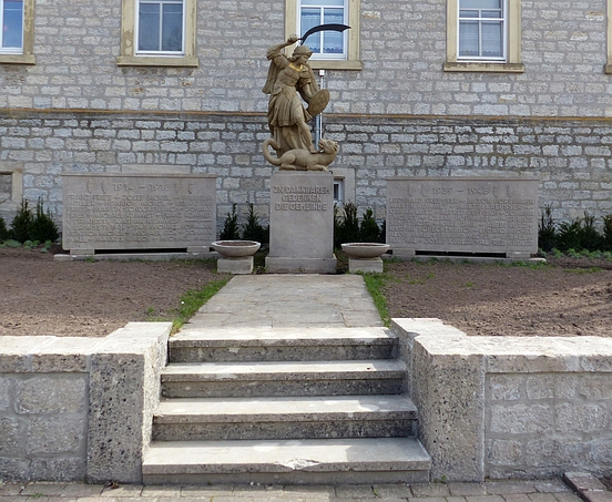 Das Kriegerdenkmal besteht aus drei Teilen. Der Mittlere zeigt eine Steinfigur des Heiligen Georg auf einem Steinsockel mit Inschrift.