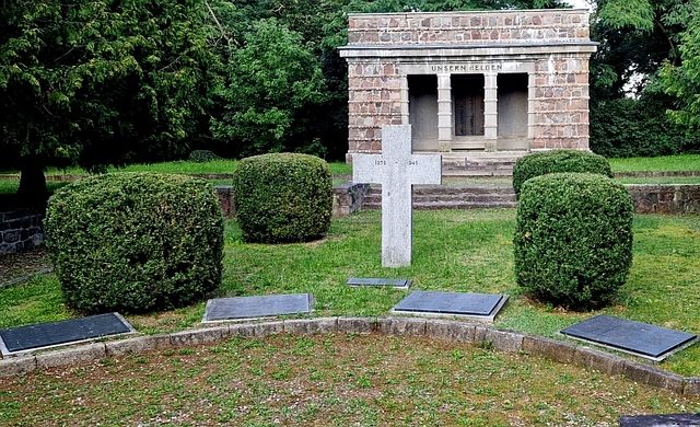 Auf der Rasenfläche steht ein großes Steinkreuz (beschriftet mit den Jahreszahlen 1939 und 1945) und Koniferen.