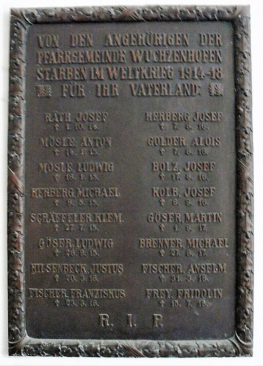 Wandplakette (Erster Weltkrieg) im Vorraum der Kath. Pfarrkirche St. Johannes Baptista, rechts vom Eingang.