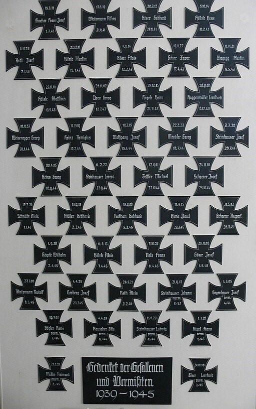 Einzelne Namenstafeln (Zweiter Weltkrieg) mit den Namen der Gefallenen, jeweils in Form eines Eisernen Kreuzes.
