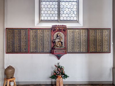 In der Mitte eine Pieta mit Verzierungen, links und rechts daneben sind die Gefallenen auf Holztafeln aufgeführt.