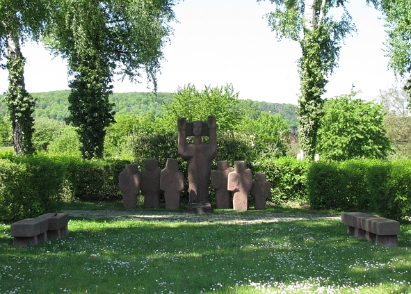 Denkmal ohne Namenstafeln im Friedhof von Zellingen. Steinfigur mit erhobenen Händen.