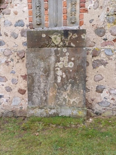 Platte an der Kirche von Zettemin in einen sehr schlechten Zustand, die Inschrift ist nur noch lückenweise zu entziffern.