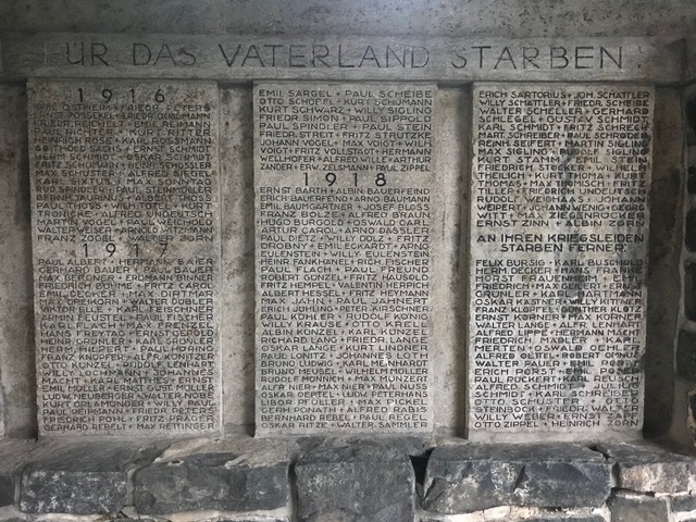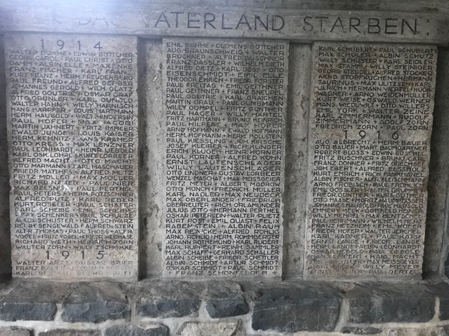 Im Inneren des Kriegerdenkmals auf dem Lerchenhügel, nahe der Rabensleite, sind an jeder Seite je drei Tafeln angebracht.