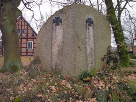 Denkmal 1. Weltkrieg (großer Findling mit angebrachten Eisernen Kreuzen aus Metall auf Feldsteinhaufen).