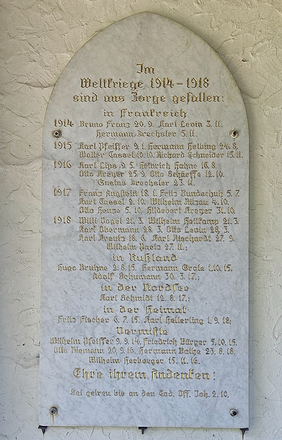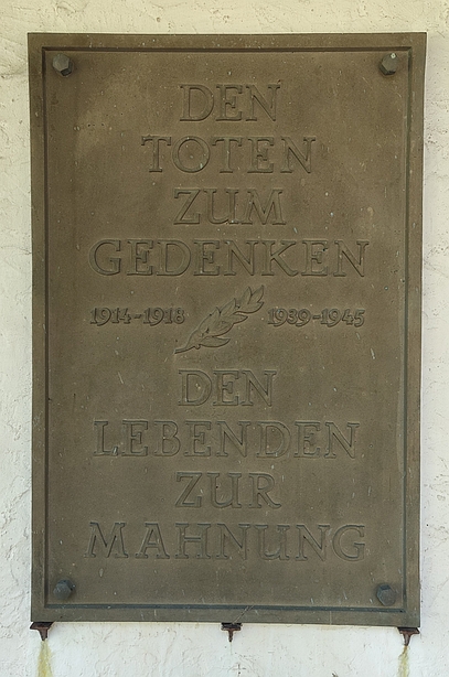 Eine Marmortafel führt die Namen der Toten des 1. Weltkriegs auf.