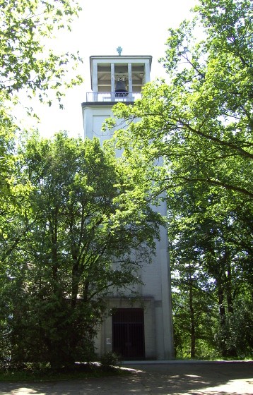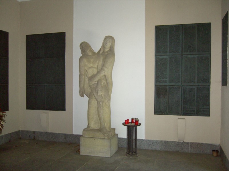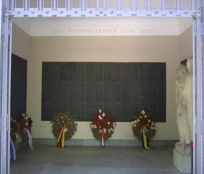 Das Mahnmal auf Schillerhöhe in der Nähe der Stadthalle: Aussichtturm mit einer Halle, an den Innenwänden der Halle sind Tafeln angebracht mit den Namen beider Weltkriege.
