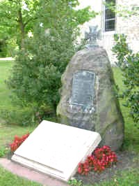 Davor eine liegende Tafel mit Inschrift. Auf dem Friedhof ein einzelnes Soldatengrab.