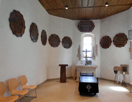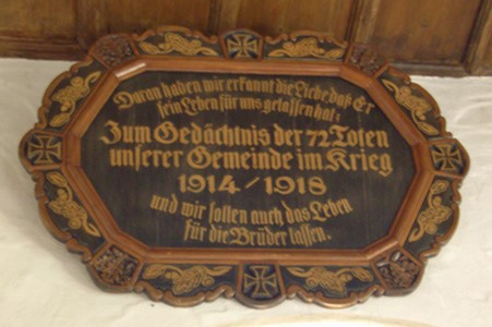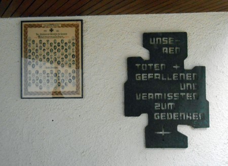 Friedhof, in der Kapelle Holztafeln mit den Namen des Ersten Weltkriegs und einer Inschrift,