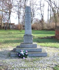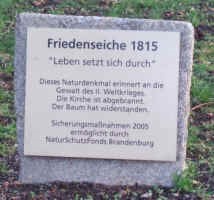 Stele vor der gegen Ende des Zweiten Weltkrieges beim Kampf um die Seelower Höhen abgebrannten und nicht wiedererrichteten Kirche und der Friedenseiche von 1815.