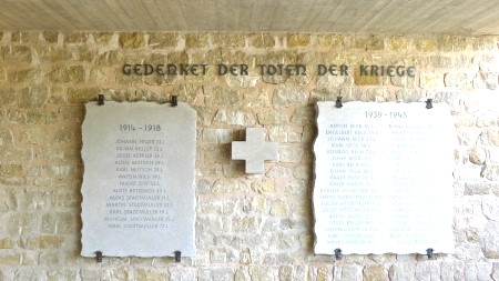 Im Eingangsbereich der Aussegnungshalle hängen an einer Wand zwei steinerne Tafeln mit den Namen der Gefallenen beider Weltkriege von Altkrautheim.