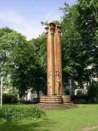 8,50 m hohes dreiseitiges Monument aus Klinker und Keramik, daran in Relief drei Männer mit Schwert und Schild.