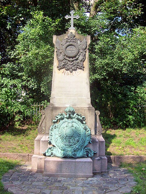 das dort stehende Denkmal, gestiftet von Kaiser Franz Joseph I., eingeweiht. Es ist ein Werk des Erbauers des Hamburger Rathauses, des