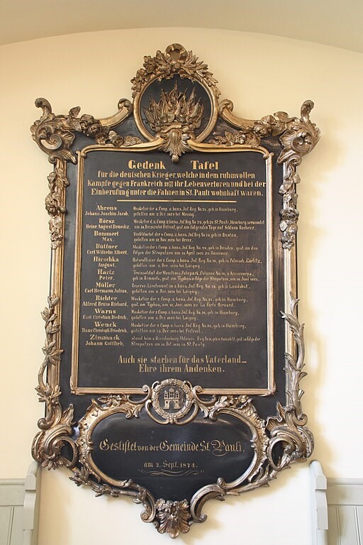 Gedenk Tafel für die deutschen Krieger, welche in dem ruhmvollen Kriege gegen Frankreich mit ihr Leben verloren und bei der Einberufung unter die Fahnen in St. Pauli wohnhaft waren.