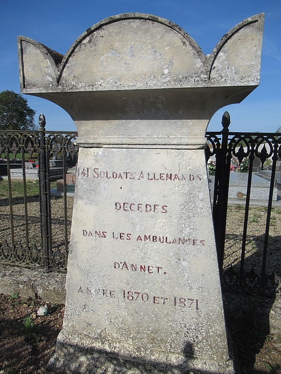 Anmerkungen: Während des französisch-preußischen Krieges von 1870-1871 hatte die sächsische Armee im Schloss von Annet-sur-Marne ein Feldlazarett eingerichtet. Die im Lazarett Verstorbenen wurden zuerst an heute unbekannten Stellen beigesetzt. Bei Kriegsende wurden gemäß Artikel 16 des Frankfurter Vertrags vom Mai 1871 und dem französischen Gesetz vom 4. April 1873 141 Leichen von Soldaten in einem Militärgrab zusammengelegt. Der Marcère Bericht von 1885 schreibt dazu: « Annet-sur-Marne: Die sterblichen Überreste von etwa 141 deutschen Soldaten, die zuvor auf Privatgrundstücken beigesetzt worden waren, wurden auf den Gemeindefriedhof verlegt. Der Staat erwarb dort eine 15 Meter große Fläche als Dauerkonzession und ließ sie mit einem Eisenzaun einfrieden. Die Besatzungsmacht errichtete ein kleines Denkmal auf der Grabstätte »