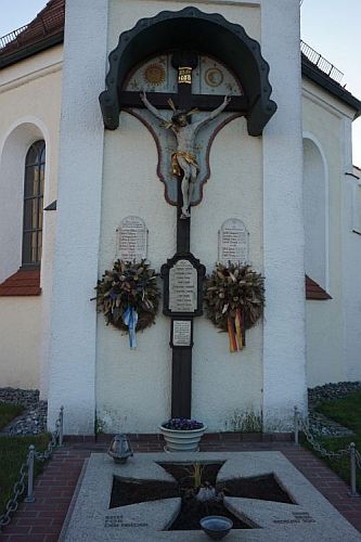 Holzkreuz mit Gedenktafel. An der Wand zwei weitere Gedenktafeln.