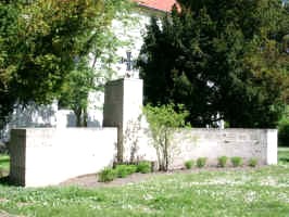 Im Halbrund eine Mauer mit einzelnen Tafeln in Sandstein mit den 6 bzw. 15 Namen der Kriegsopfer.