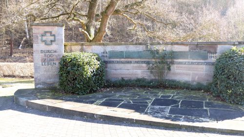 Steinwand, daran ein Kreuz mit Inschrift, daneben Metallgedenktafeln.