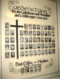 Auf einem etwa DIN-A-1 großem, von einem Holzrahmen gefassten Kartonpapier im Querformat, wurde ein schwarzes Balkenkreuz handgezeichnet, um das sich 58 Passfotos mit den handschriftlich vermerkten Namen, Vornamen und dem Todesdatum der Gefallenen und Vermissten der Gemeinde gruppieren. In einigen Fällen sind auch das Geburtsdatum und der Dienstgrad vermerkt. Die Wandplakette ist im Innenraum der Kirche zu Bad Eilsen angebracht.