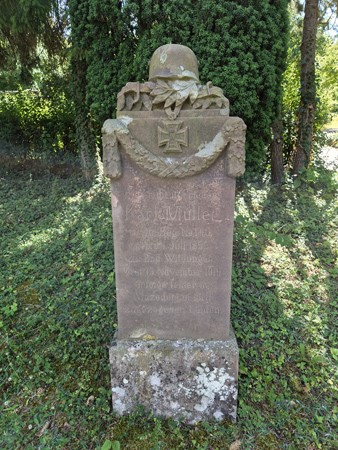 Der Stein ist mit Helm, Lorbeer-, Eichenlaub und Ehrenkreuz verziert.