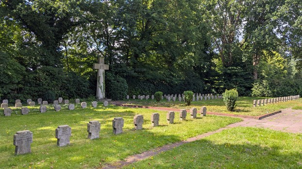 Auf dem neuen Friedhof am Diekweg befindet sich links hinten eine gepflegte Kriegsgräberstätte.