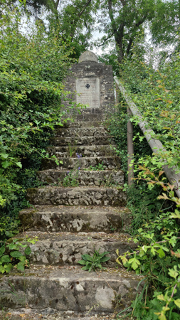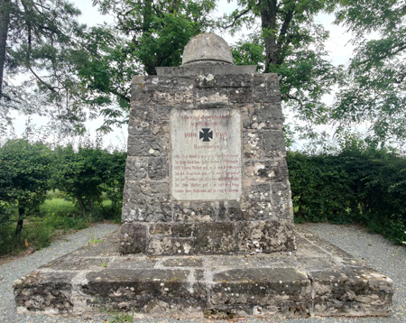 Das Denkmal mit krönendem Stahlhelm liegt versteckt auf einem kleinen Hügel am Ortsrand.