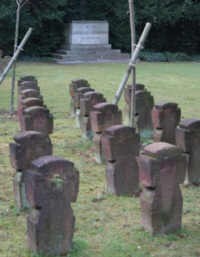 Die Namen stehen auf roten Steinkreuzen. Diese sind sehr verwittert.
