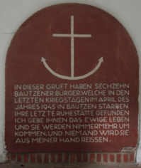 In dieser Gruft haben sechzehn Bautzener Bürger, welche in den letzten Kriegstagen im April des Jahres 1945 in Bautzen starben, ihre letzte Ruhestätte gefunden. Ich gebe ihnen das ewige Leben und sie werden nimmermehr umkommen, und niemand wird sie aus meiner Hand reissen.