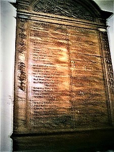 Große hölzerne Tafel im Eingangsraum der Kirche mit den Namen der Gefallenen des Erster Weltkriegs.