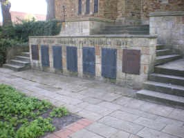 Auf sieben Tafeln an einer gemauerten Wand, eingerahmt von zwei Treppenaufgängen, unterhalb der Kirche, sind die Gefallenen des Zweiten Weltkrieges aufgelistet.