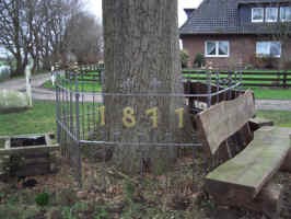 Von einem Eisenzaun eingefasste Friedenseiche mit der Jahreszahl 1871, an der Dorfstraße/Ecke An der Friedenseiche gelegen.