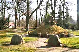 Um den Hügel herum ein Kreis von gesetzten Steinen (Findlingen), 19 an der Zahl mit den Namen und Todesdaten der Kriegstoten des Ersten Weltkrieges.