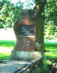 In einer Anlage in Dorfmitte: Ein Monolith mit davorgesetzter Mauer aus rotem Klinker, darin eine Granittafel mit Inschrift.