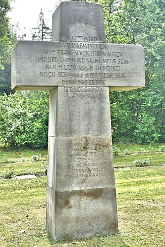 Großes Steinkreuz mit Inschriften, davor Gedenkplatten mit den Namen.