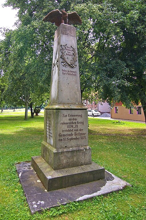 Auf dem Kirchhof von Bettmar ein Obelisk auf gestuftem Sockel, auf der Spitze ein Adler mit ausgebreiteten Schwingen