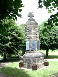 Auf dem Friedhof das Ehrenmal für die Kriegstoten beider Weltkriege in Form eines gestuften Rundbaues, auf der Spitze ein Eisernes Kreuz.