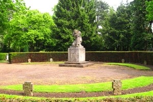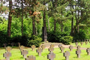 Zweiter Weltkrieg: Von einer Hecke eingefasstes Rondell mit Skulptur eines knienden, trauernden Soldaten, Inschrift und Relief eines Adlers auf dem Sockel, darum in mehreren Feldern angeordnet 250 Grabsteine in Gestalt stilisierter Eiserner Kreuze, überwiegend je mit zwei Namen/Geburts- und Todesjahr von Gefallenen bzw. Zivilopfern.