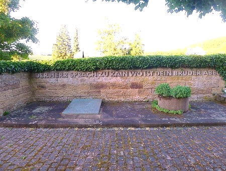 Aus Schilfsandsteinquadern gemauerte Wand mit dem nachstehend angegebenen Schriftzug und mit einer davor auf dem Boden liegenden