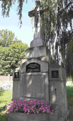 Denkmal für die Gefallenen des 1. Weltkriegs auf dem örtlichen Friedhof. Aus Steinblöcken errichteter Unterbau mit angebrachter Widmungs- und Namenstafel und aufgesetztem großen Kruzifix.