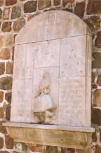 Wandplakette außen an der Kirchenmauer. In deren Mitte ein Relief mit Stahlhelm und darauf sitzender Friedenstaube mit Ölzweig.